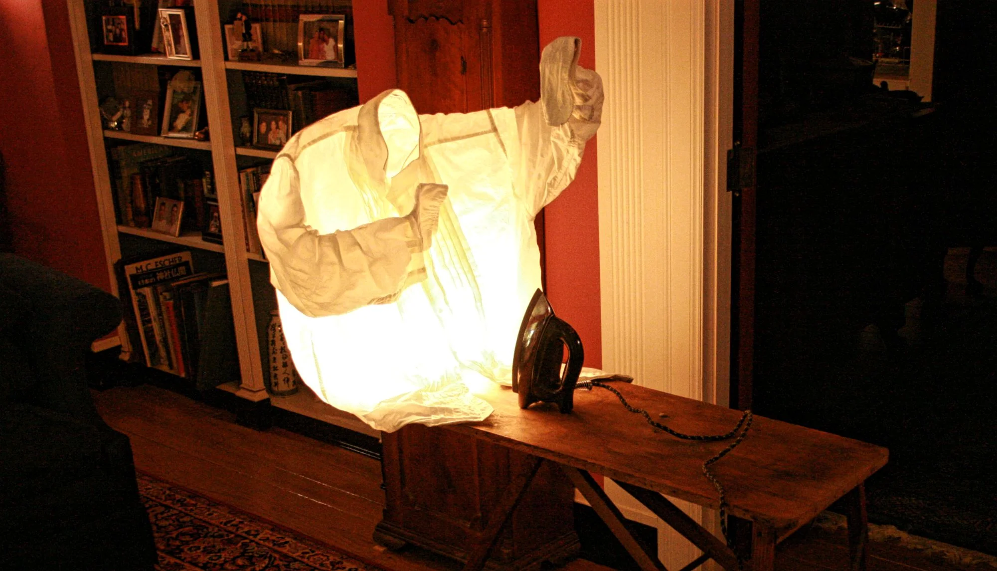 The ironing board lamp is a whimsical piece that I found humorous. Thinking about a horribly wrinkled shirt recoiling from an iron that was trying to make it 'conform' just tickles me. Its made from an antique ironing board with an antique iron that operates the light (the guts of which are simple yet confusing).